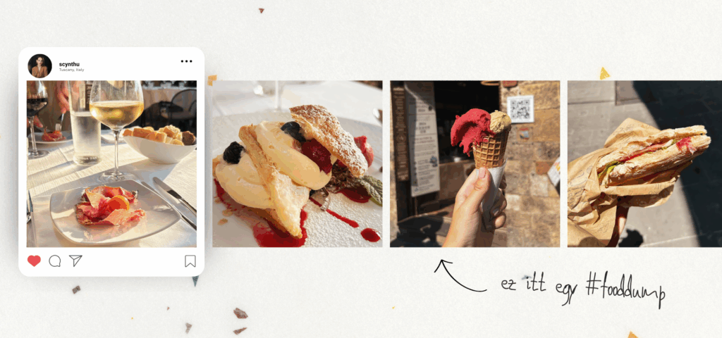 Én például egy toszkánai utazásról készítettem food dumpot. Összegyűjtöttem azokat az ételeket és italokat, amiket ott kóstoltunk.